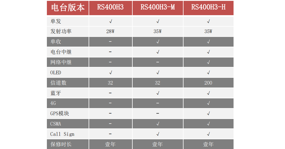 RS400H3配备有高清OLED显示屏和按键,用于检查操作状态、更改工作通道和发射功率水平,支持串口波特率智能识别、开机状态智能识别、干扰检测等功能。RS400H3电台有三种版本:RS400H3,RS400H3-M,RS400H3-H。